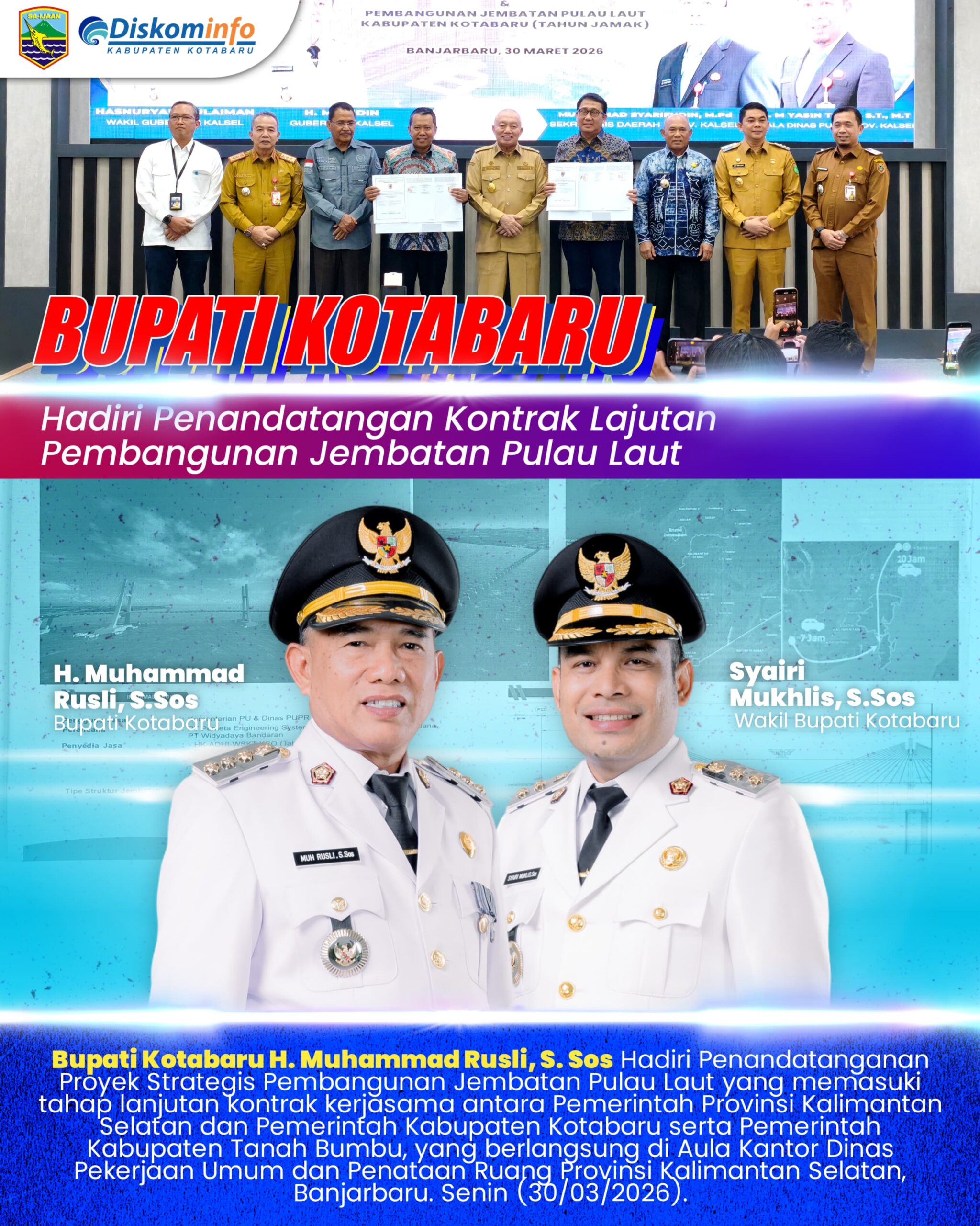 GENERASINEWSINDONESIA.COM Banjarbaru – Bupati Kotabaru H. Muhammad Rusli, S. Sos Hadiri Penandatanganan Proyek Strategis Pembangunan Jembatan Pulau Laut yang memasuki tahap lanjutan kontrak kerjasama antara Pemerintah Provinsi Kalimantan Selatan dan Pemerintah Kabupaten Kotabaru serta Pemerintah Kabupaten Tanah Bumbu, pada Senin (30/03) di Aula Kantor Dinas Pekerjaan Umum dan Penataan Ruang Provinsi Kalimantan Selatan, di Banjarbaru.