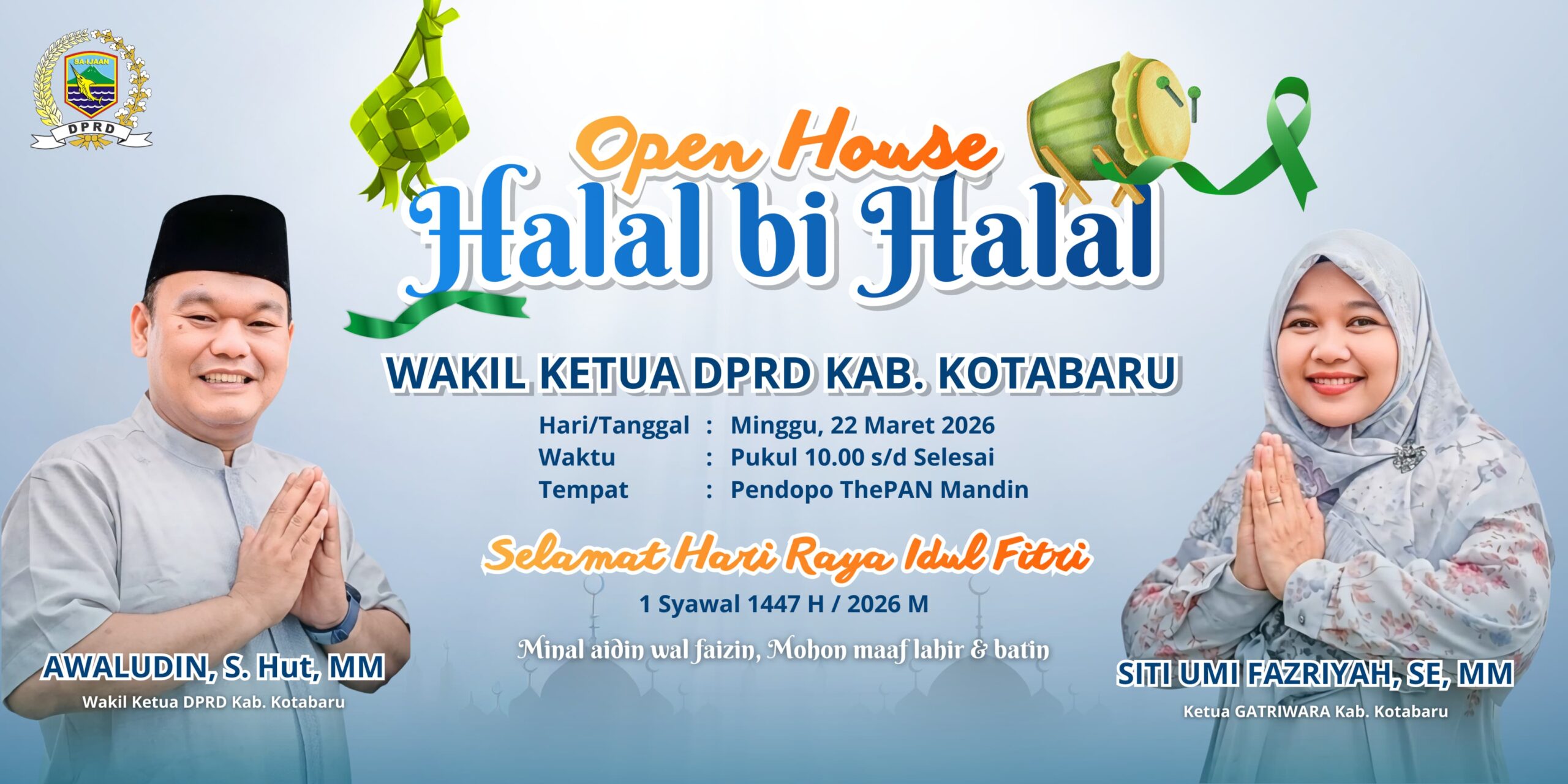 GENERASINEWSINDONESIA.COM Kotabaru – Dalam rangka mempererat tali silaturahmi di hari kemenangan, Wakil Ketua 1 DPRD Kabupaten Kotabaru, Awaludin, menjadwalkan akan menggelar acara Open House pada hari kedua Hari Raya Idul Fitri 1447 H. Kegiatan ini direncanakan berlangsung pada Minggu (22/03) di Pendopo ThePAN, Jalan Mandin Desa Semayap, Kecamatan Pulaulaut Utara, Kabupaten Kotabaru, Kalimantan Selatan.